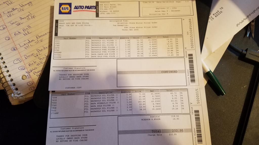 Spin on largest filter sump','2021-08-20','05-24-2017|440','135.pdf','135B.jpg'),(136,7,158,NULL,'F','2023-05-02',146,216,300,0,1,1,'2nd fuel','Na','2nd fuel filter\r\nNA600313','','05-02-2023|165|109\r\n04-11-2023|1|0\r\nNew tractor','2.pdf','136B.jpg'),(137,31,68,NULL,'F','2019-01-10',0,0,850,0,2,1,'','','Hp 2nd diesel tank or west tank','2025-09-25','01-10-2019|0|0,','137.jpg','137B.jpg'),(138,16,61,NULL,'A','2017-08-31',0,2840,100,0,1,0,'�','�','clean the air filter','','p145465 Donaldson inner air filter\r\n08-31-2017|2674|0,07-06-2016|2572|0,�','138.jpg','138B.jpg'),(140,76,61,NULL,'G','2018-10-15',0,243,50,0,1,0,' ',' ','Front wheels, deck top, many zerts','','10-15-2018|191|0,04-10-2018|95|0,05-18-2016|0|0, ','140.jpg','140B.jpg'),(141,76,97,NULL,'O','2018-10-15',0,243,50,0,1,1,'.85 gal','9/16 socket onl','10w - 30 oil or 15w - 40','2018-05-23','10-15-2018|39|0,','141.jpg','141B.jpg'),(142,72,61,'','G','2025-06-12',0,977,100,0,1,0,'','','4 front, steering, 5 rear\r\npage 103','','06-12-2025|763|0\r\n08-05-2021|568|0,07-01-2019|458|0,06-22-2018|339|0,04-04-2017|231|0,04-07-2016|97|0,','207.pdf','142B.jpg'),(143,72,100,',NA7430','O','2021-08-05',0,763,300,0,1,1,'12 qt','7/8 in 2 plug','15 w 40\r\n\r\npage 114','','08-05-2021|339|0,04-04-2017|334|0,04-04-2017|339|0,04-04-2017|339|0,','207.pdf','143B.jpg'),(144,72,122,',NA7098','H','2021-08-05',0,763,200,0,1,2,'HYDRAULIC FILTE','Spin on','2 filters\r\npage 115','2026-03-19','08-05-2021|339|0,04-05-2017|0|0,','207.pdf','144B.jpg'),(145,72,155,',HH166-43560','F','2022-07-11',0,819,400,0,1,1,'replace','fuel filter','Replace final fuel filter\r\n\r\npage 115\r\n\r\nbleed fuel system page 123','2021-12-03','07-11-2022|0|0,','207.pdf','145B.jpg'),(146,72,61,NULL,'C','2022-07-11',0,819,500,0,2,0,'','Check coolant','Check temp and condition','2024-09-03','07-11-2022|763|0,-30 F\r\n\r\n08-03-2021|458|0,09-17-2018|0|0 -30 degree F','207.pdf','146B.jpg'),(148,76,127,NULL,'A','2018-10-15',0,243,100,0,1,0,'�','�','clean air filter on right back lower side of motor NA 6449 and NA 2845','','10-15-2018|95|0,05-18-2016|0|0,�','148.jpg','148B.jpg'),(149,6,61,'','A','2020-01-20',0,1119,100,0,1,0,'Clean engine','','